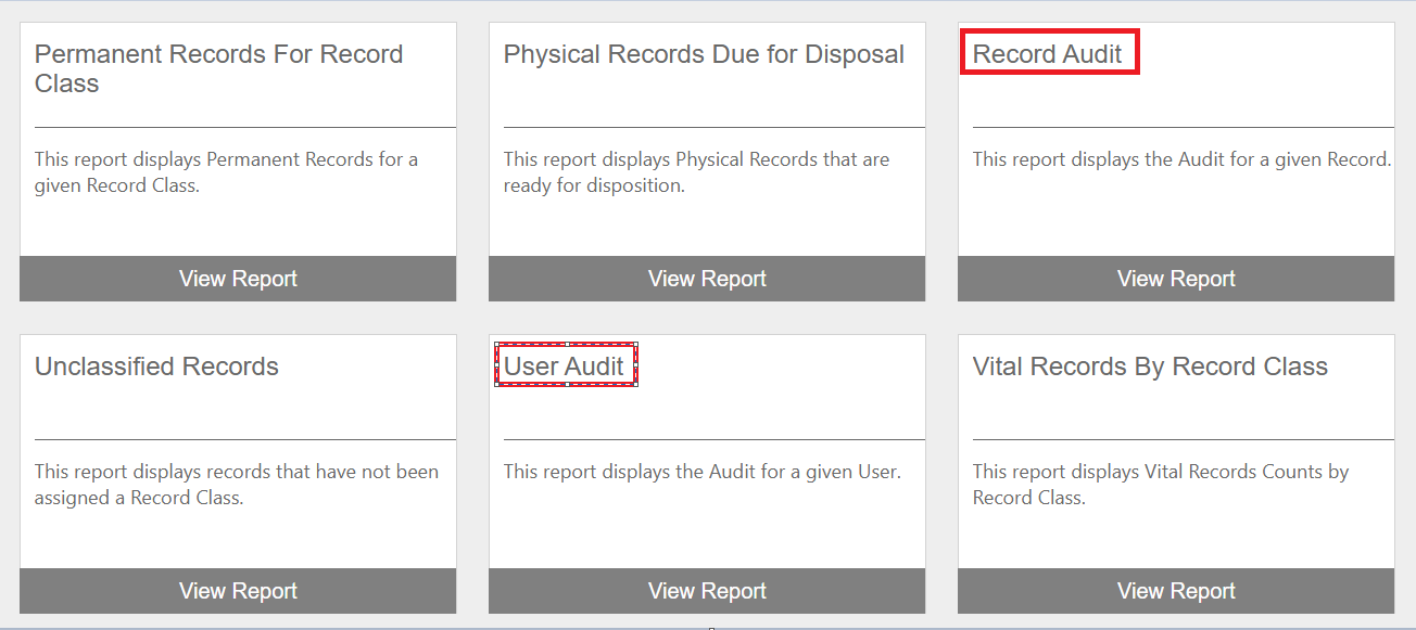 Native stock reports may also be used to analyze audit trail information. From the Monitor page, click Reports within the left-hand panel. Click the View Report button for either the ‘Record Audit’ or ‘User Audit’ report. Each may be filtered as desired.