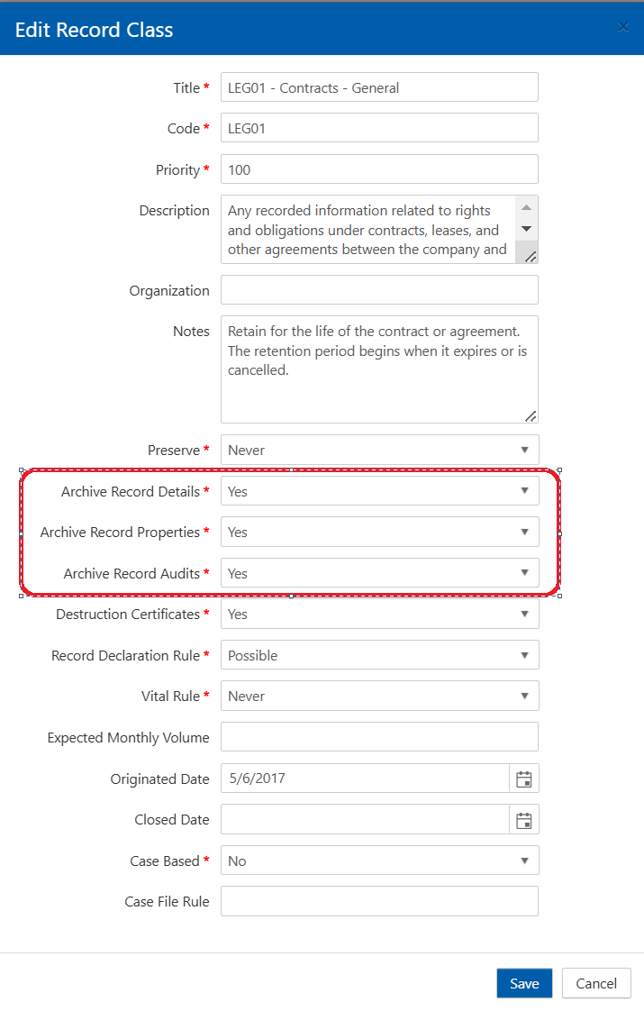 Notice below, that each Record Class within the system allows you to choose what subset of records data within that class gets archived: