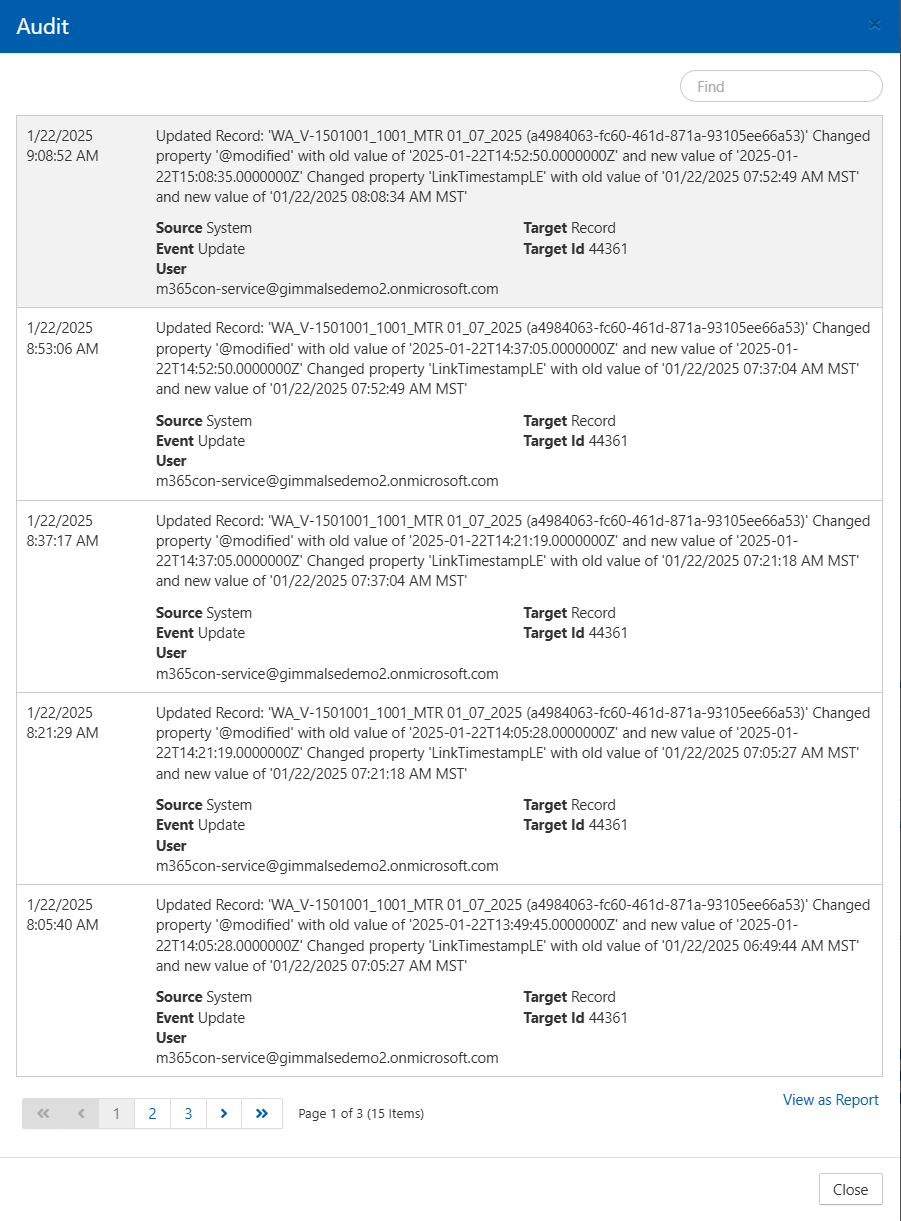 As shown below, the Audit trail specific to that record will be displayed. Note you can filter the audit trail using the ‘Find’ search box, and you can also produce a report via the ‘View as Report’ link in the lower right.