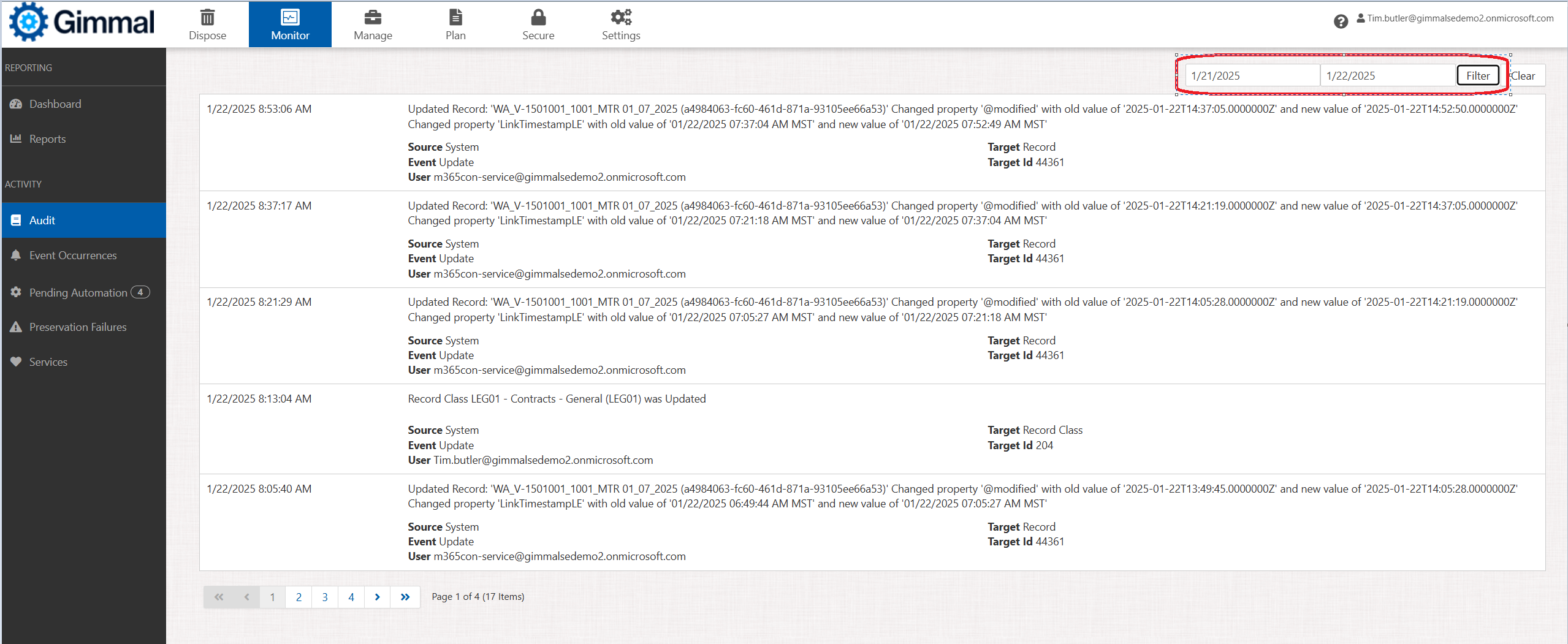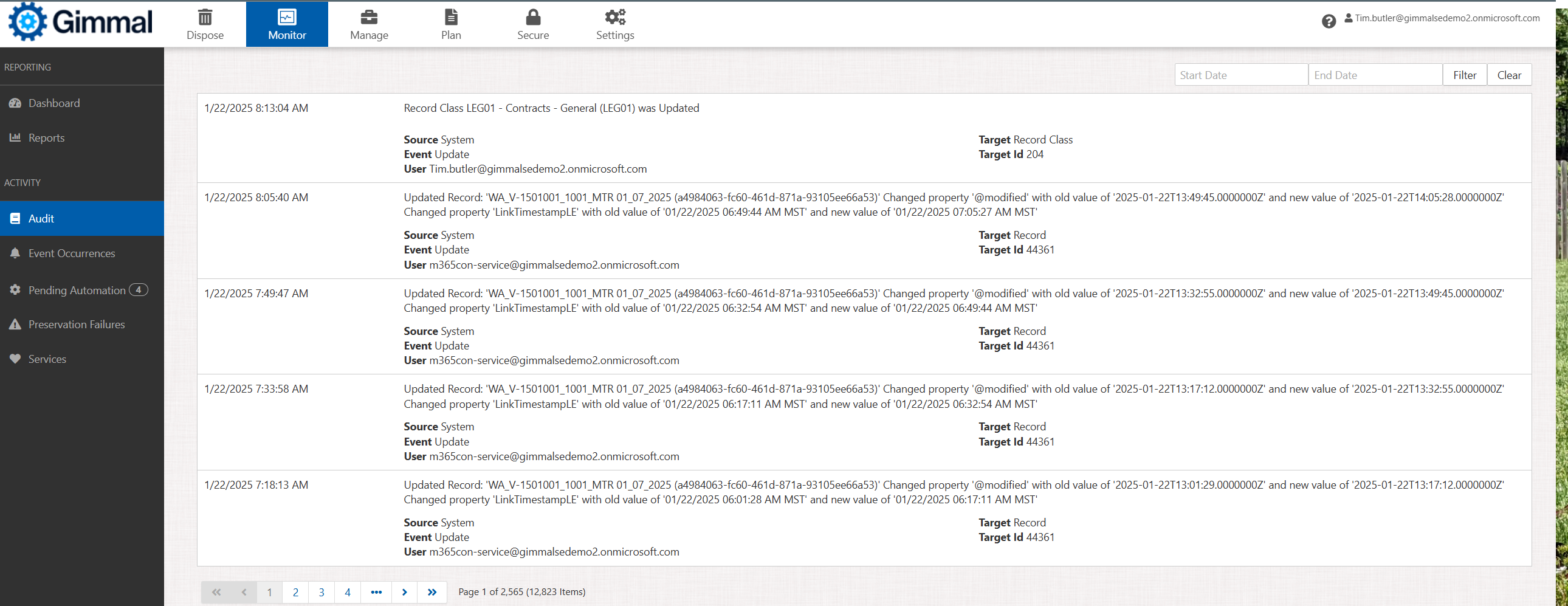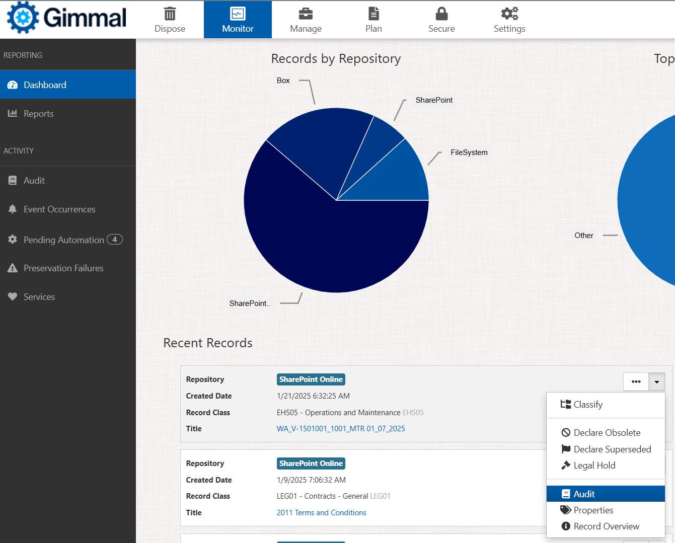 Gimmal Records provides two separate views into all this activity, or audit trail: one from an overall system perspective and the other specific to individual records.