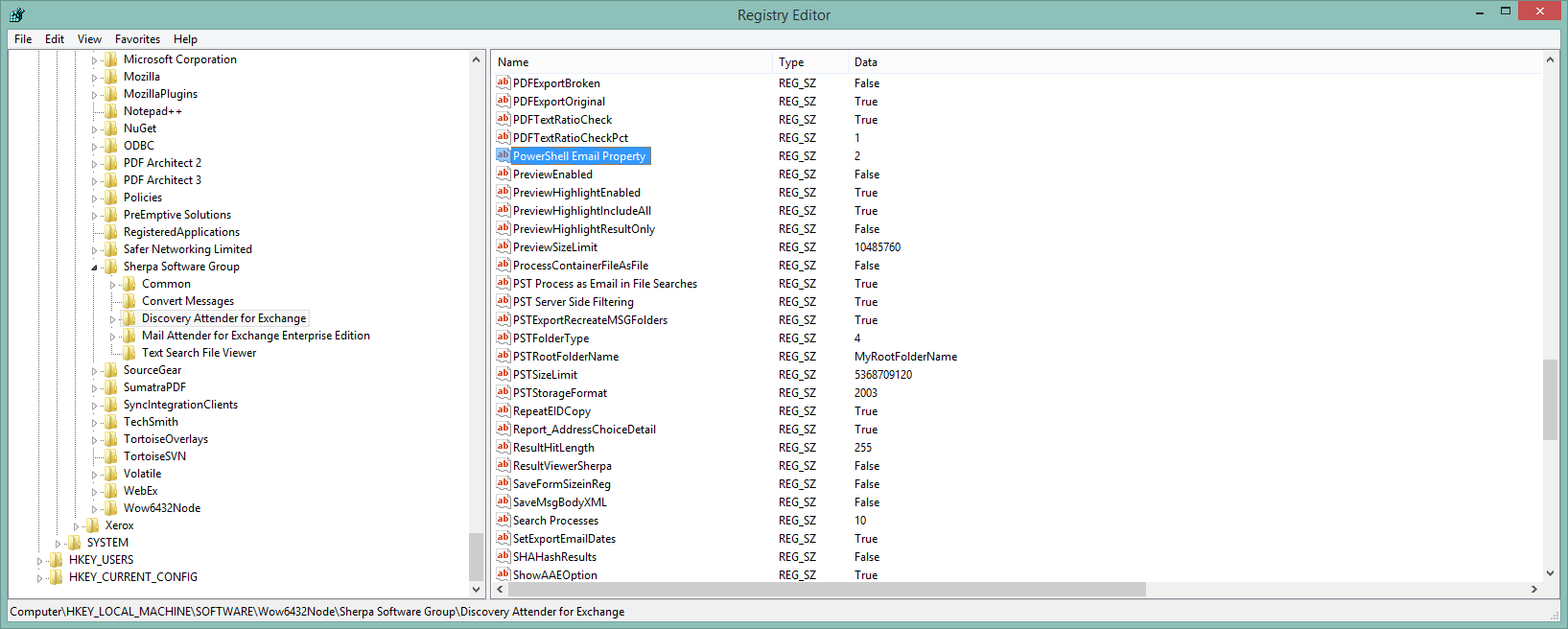 DA 32-bit: HKLM\SOFTWARE\Sherpa Software Group\Discovery Attender for Exchange