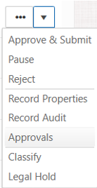 Disposition Approval workflows can be defined in the File Plan menu for any record class or record category. You can see if a record is part of an approval workflow by clicking the pull-down menu to the right of the record and selecting Approvals. You will see the list of previous and future approval steps.