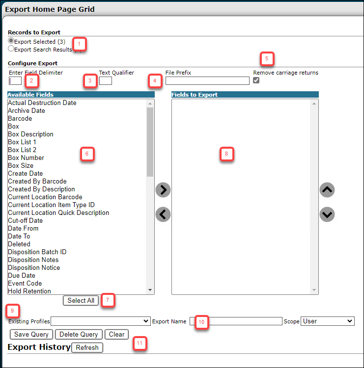 Export Name - Save name for the current Fields to be Exported configuration (used with Save Query). It can be found in the Existing Profiles dropdown once saved.