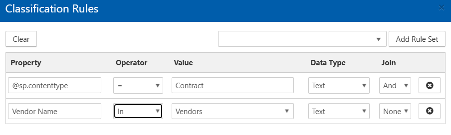 Our example rule is going to have two conditions that must be satisfied (an AND condition). The first condition will look for a specific content type in SharePoint called Contract. Our second condition will use the Internal List.