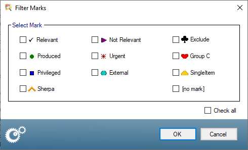 To use the filter for the Mark, select the icon or icons (or [no mark]) to show and click ‘OK’. Only the results with the chosen mark (or [no mark]) will then be shown in the view.