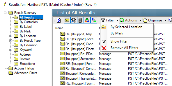 Any view listing individual results, including All Results and Unique Items, will include standard filters. The toolbar will contain a set of default filters for result types. Additionally, the toolbar and context menus will include a button or menu item called ‘Filter’, offering additional choices.