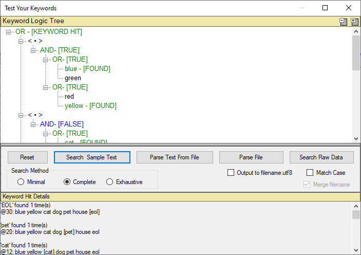For example, when using the expression: ((blue OR green) AND (red OR yellow)) OR ((cat OR dog) AND (lion* OR tiger* OR bear*)) , you may want to report on (blue OR green) AND (red OR yellow) as one branch hit and (cat OR dog) AND (lion* OR tiger* OR bear*) as another.