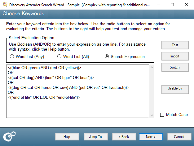 To ensure that expression branch hits are reported correctly in the keyword views and reports, the search expression created in the Choose Keywords wizard screen needs to be adjusted. The ‘Reporting Brackets’ are the less-than and greater-than signs ("<",">"). They must be used at the beginning and end of the portion of the expression which you wish to delineate as a discreet branch of a larger search expression (i.e. <expression>).