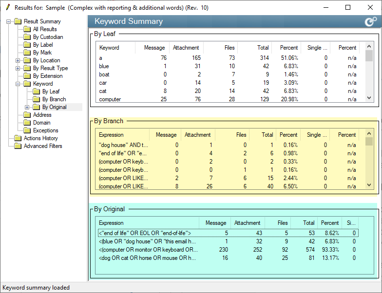 All searches which contain keyword criteria will have individual keyword reporting (‘By Leaf’) populated in the Result Management Keyword screen. However, only by using special Reporting Brackets will you be able to populate the ‘By Branch’ and ‘By Original’ portions of the Keyword view. Furthermore, this option will open up helpful information in the detailed and list view reports.