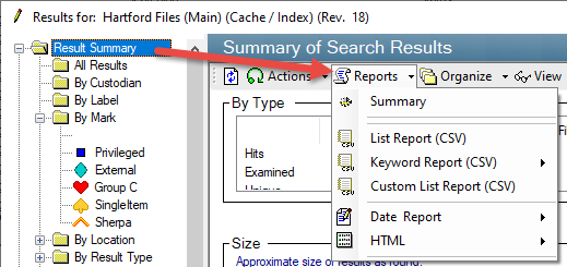 The views available in Results Management tend to contain generic metadata. However, for reporting purposes, users may want a summary of the search, or a full listing of items where additional metadata is needed. These details can be found using built-in reports found in the Results Summary ‘Report’ file menu item.