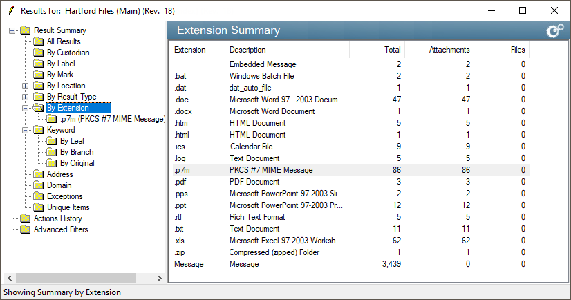 Discovery Attender provides information presented in useful views for key metadata like locations, addresses and file types. Further details are available in the sub views to help review specific aspects in more detail. In the Address and By Extension views, for example, double-clicking on the value will open a view showing results limited to the selected item.