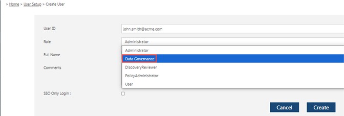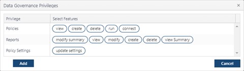 For instance, if Data Governance is selected, the three Privileges are; Policies, Reports, and Policy Settings. For each of these, Features can be selected, which for example, are comprised of View, Create, Delete, Run, etc.