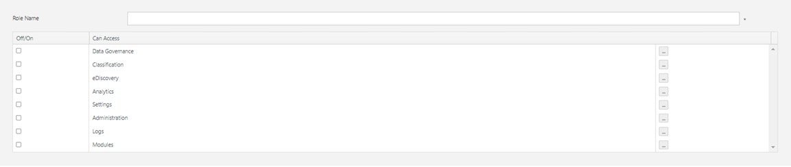 Four standard roles are available to be assigned to any account, as highlighted above. In addition, custom roles can be created that can get as granular as what action can be performed within the various modules. These roles are very useful when you need to allow a user access to Gimmal Discover, but whose access should be limited. When creating a new Role, you will have the ability to select which of the eight components of Gimmal Discover the Role can have, as seen below.