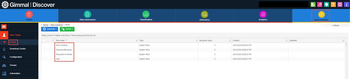 Gimmal Discover offers Roles to help authorize or limit what an account can do. You will find the Roles by clicking on ‘Administration’ in the top banner: