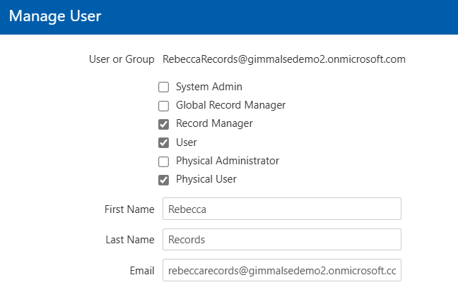 For Rebecca Records, we entered her name and her email address. The email is used for any notifications that include Rebecca. We have selected the roles of Record Manager, User, and Physical Records users.