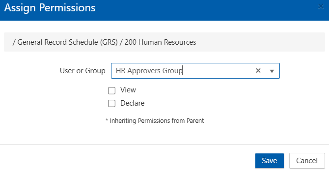 For example, you could have a group called Local Records Managers, or a group named First Level Approvers. You then assign users to the group and use the group name for assigning permissions to a record class.