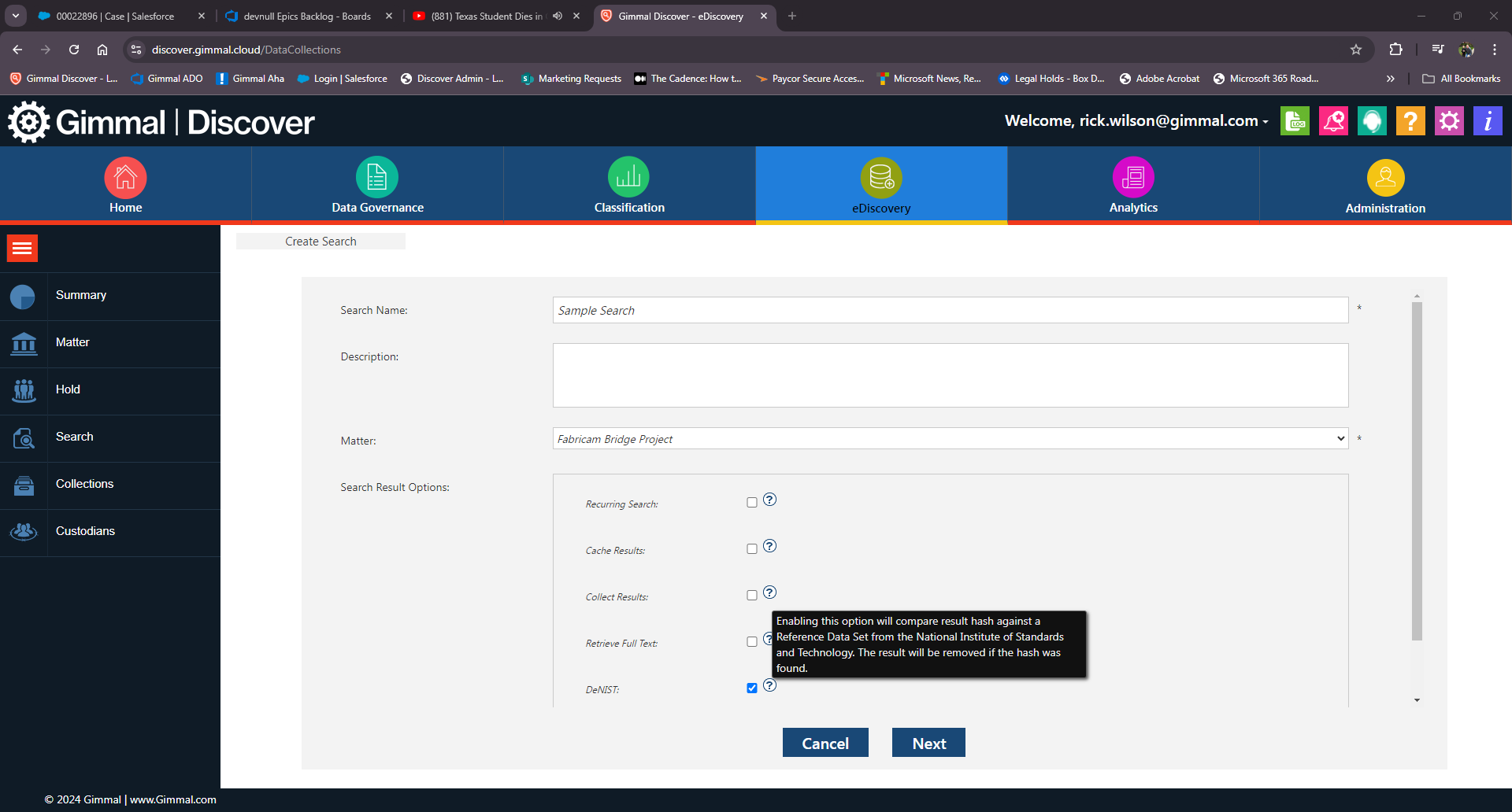 One of the often overlooked features available in the eDiscovery module of Gimmal Discover is the ability to automatically DeNIST a search result set. The National Institute of Standards and Technology (NIST.gov) has a sub-project called the National Software Reference Library, which collects a master list of known, traceable computer applications. The DeNISTing process uses this list to identify computer files known to be unimportant system files and remove them.