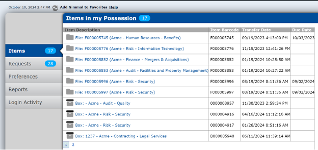 The Requested Items panel lists all records you’ve requested, whether pending or fulfilled. This feature: